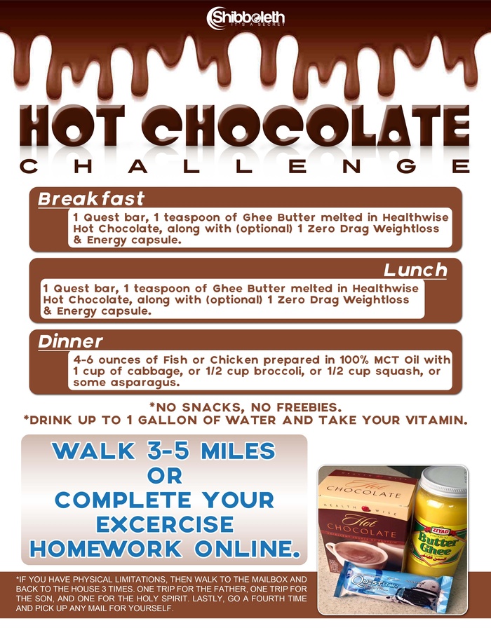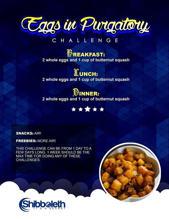 This challenge is designed to help you re focus and to garner mometum again. Follow instructions exactly. You should only consider this a successful fast day if you complete this challenge exactly. The Bible encourages us to fast for health reasons and/or spiritual reasons. Your approach with this is up to you. Fasting doesn't always mean to go without food. You may choose this challenge, submit to it and avoid all other "pleasant" food to insure that you regain self control. Enjoy! Daniel 10:3 -I ate no pleasant bread, neither came flesh nor wine in my mouth, neither did I anoint myself at all, till three whole weeks were fulfilled.
